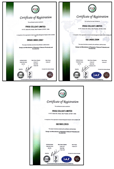 Both Noida and Dehradun manufacturing units of Frog Cellsat Ltd. are now ISO 9001:2015, ISO 14001:2004 and OHSAS 18001:2007 certified.